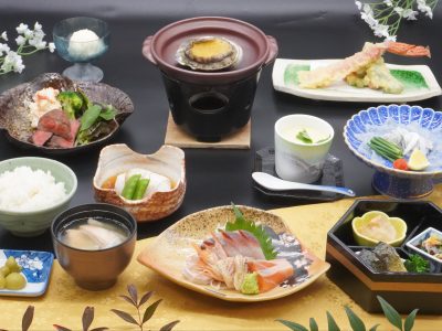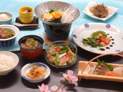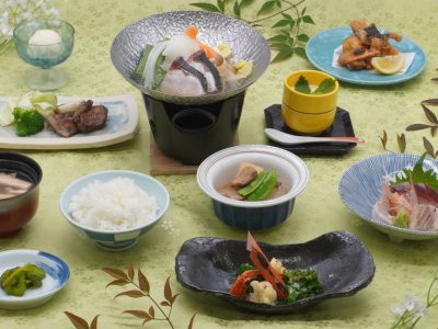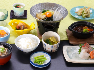 下関名物「ふく」をはじめ、新鮮な海の幸や豊かな山の幸をふんだんに使用した会席料理が自慢です。