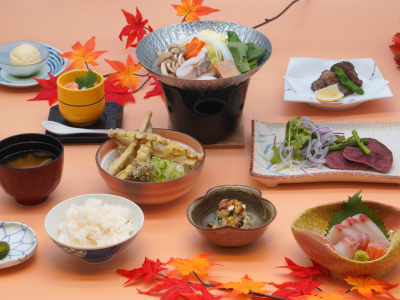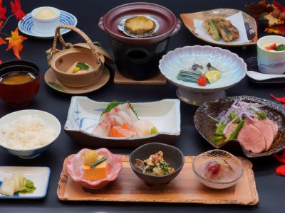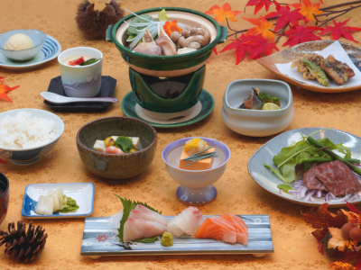 下関名物「ふく」をはじめ、新鮮な海の幸や豊かな山の幸をふんだんに使用した会席料理が自慢です。